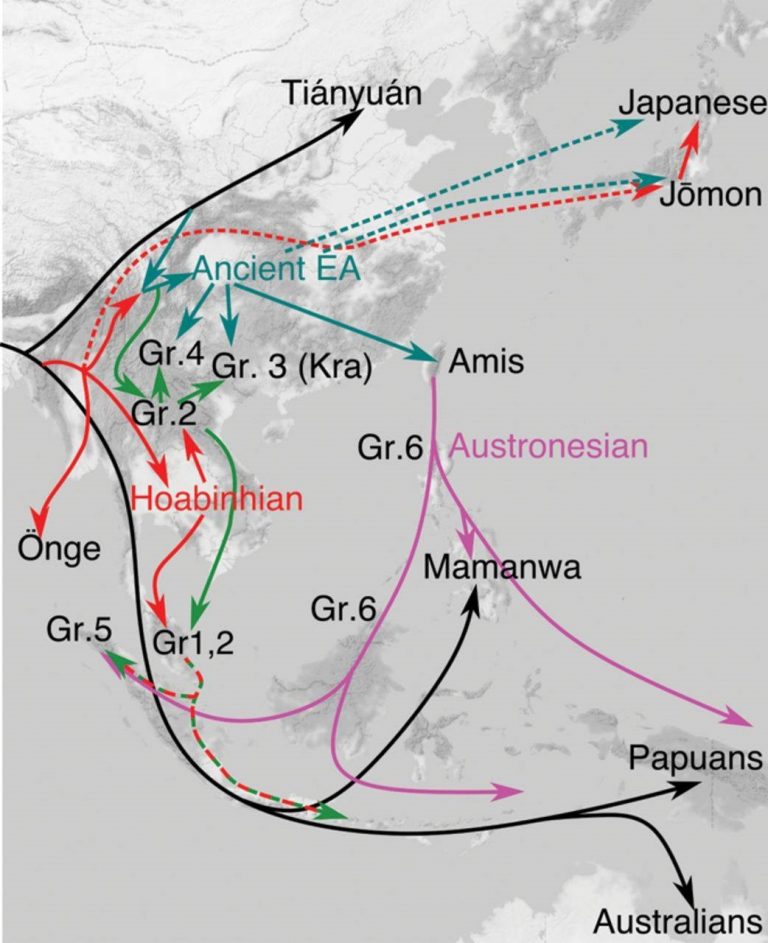 Theo các nghiên cứu di truyền, thì cư dân Đông Nam Á cổ đại có nguồn gốc từ châu Phi, di cư sang vùng Đông Nam Á vào khoảng 30.000-60.000 năm trước [2][3], tới khoảng 12000 năm trước, thì cư dân văn hóa Đông Nam Á cổ đại đã di cư lên vùng phía Bắc [4][5][6][7], trong đó hai địa bàn chủ yếu của họ là vùng nam Đông Á (đồng bằng sông Dương Tử) và vùng bắc Đông Á (đồng bằng sông Hoàng Hà), hình thành nên các văn hóa lớn trong vùng nam Đông Á và bắc Đông Á: văn hóa Cao Miếu (Gaomiao, 5000 – 3500 BC), Hà Mẫu Độ (Hemudu, 5000 – 4500 BC), Mã Gia Banh (Majiabang, 5000 – 3000 BC), Lăng Gia Than (Lingjiatan, 3800 – 3500 BC) nam Đông Á, và các văn hóa Hồng Sơn (Hongshan, 4700 – 2900 BC), Đại Vấn Khẩu (Dawenkou, 4300 BC – 2400 BC), Ngưỡng Thiều (Yangshao, 5000 BC – 3000 BC) trong vùng bắc Đông Á.