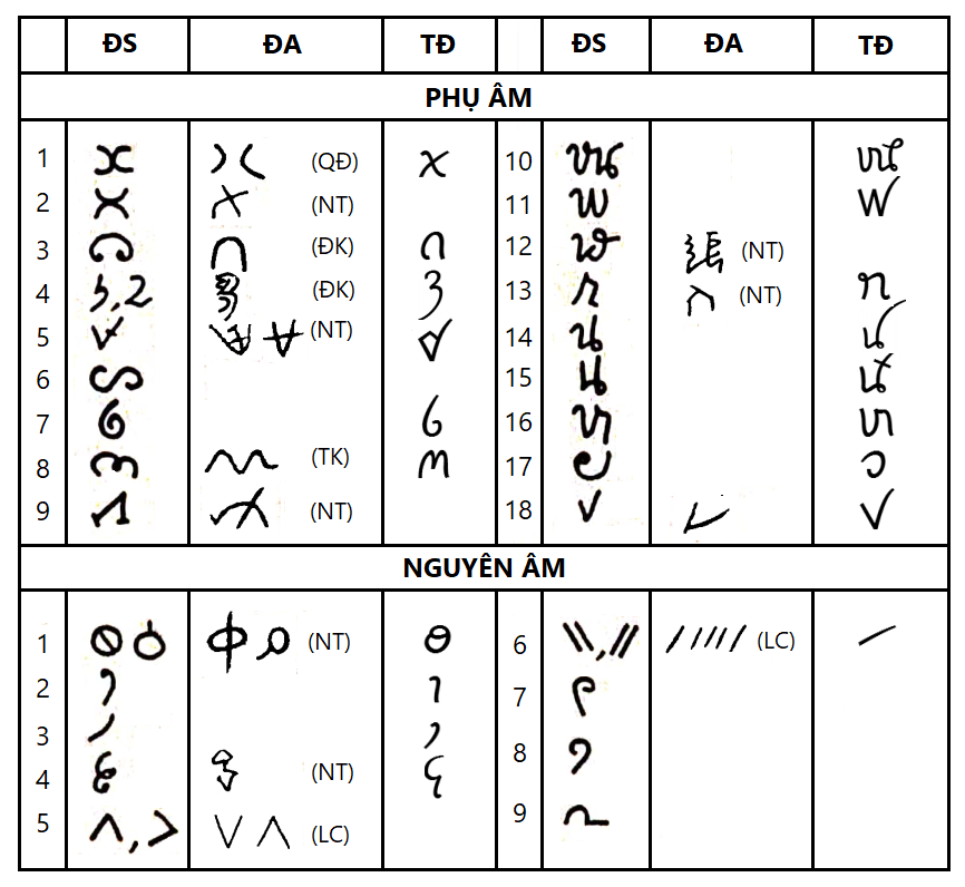 So sánh các chữ của văn hóa Đông Sơn với chữ của văn hóa Đông Á cổ đại, văn hóa trong vùng Dương Tử và Quảng Đông và chữ của người Thái Đen (Tai Viet). Các tên viết tắt: ĐS: Đông Sơn; ĐA: Đông Á; TĐ: Thái Đen; NT: Ngô Thành; LC: Lương Chử; QĐ: Quảng Đông, ĐK: Đại Khê; TK: Tống Khê. [Nguồn chữ Thái: dẫn]