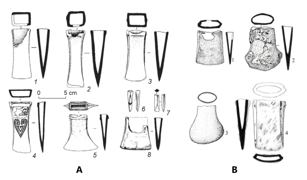 Rìu cân xòe cùng với công cụ lao động của văn hóa Ngô Thành (A) và văn hóa Đồng Đậu (B), có thể thấy rất rõ đặc trưng của văn hóa tộc Việt trên các cổ vật này của văn hóa Ngô Thành. [Nguồn: 1. [26]; 2. [27]]